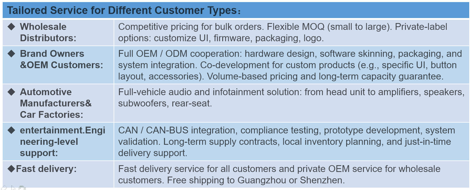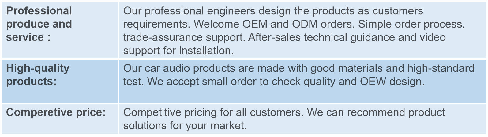 Jiangmen Meisound Electronics Technology Co.,Ltd is a professional manufacturer of car audio products, including car MP3 player, car MP5 player, car android player, car speaker, car amplifier and so on. Our factory was established in 2009, located in Jiangmen City. We are able to successfully meet the needs of international markets through competitive prices, quality, reliability, on-time delivery and the highest standards of services. Our products are exported to Europe, North America, South America, the Middle East, Southeast Asia, and Africa, earning a strong reputation for stable quality and competitive pricing. Many of our automotive lighting and security products meet international certifications such as CE, RoHS, E-MARK. Try to offer the good quality and competitive price. We provide OEM services and accept customized order as well. We sincerely welcome you to visit our factory and cooperate with us on the basis of mutual benefits. We are looking forward to your trail order to test our quality and service. |